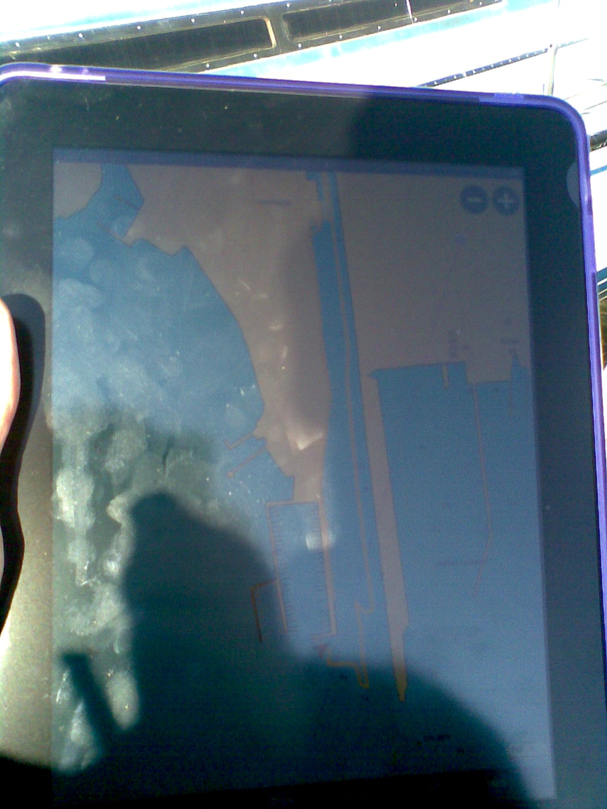 Trots skinande sol från klar himmel gick det ju utan problem att se skärmen på iPaden, även med solglasögonen på. Se bilden nedan som jag knäppt med min mobilkamera.