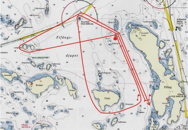 Startplatsen ligger väster om Fifång i höjd med Oxnö. Starta mot norr.