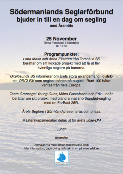 Sörmlands Seglarförbund, SdSF ordnar den 25 november en dag om segling. Dagen kommer att innehålla föredrag, information, prisutdelningar och SdSFs Årsmöte.