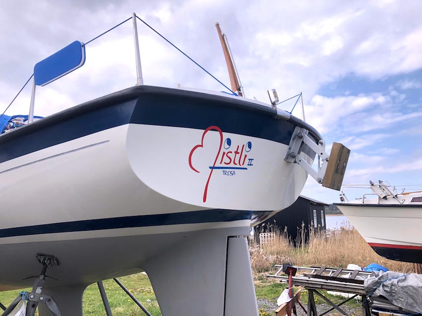 Precis som den lilla Monark 44 han hade för några år sedan fick denna båt namnet Mistli. Ett eget namn bestående av de första bokstäverna i barnbarnens namn. MIchelle, STina och LInnéa. Efter pappas skiss fixade jag en digital fil i Illustrator och Emma på Ethos Design här i Trosa printade och skar ut.