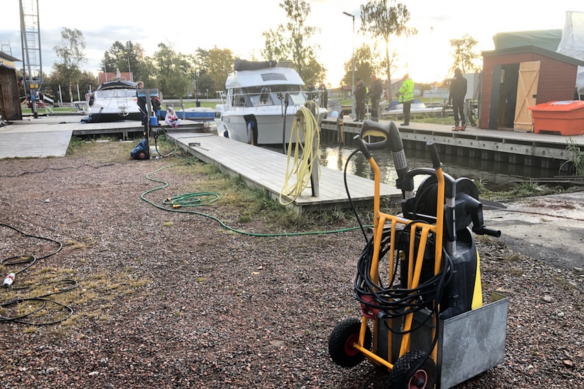 I samband med upptagning spolar ju många sina bottnar rena från smuts och beväxtning. Högtryckstvättarna går på högvarv.
