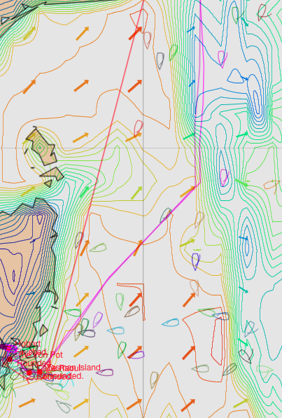 Jag vaknar upp cirka 30 minuter innan rundning och kollar in nuvarande vindar och vindarna framåt in mot Hobart och målet. Ser trixigt ut. Nordvinden ska vrida mot väst. Ser perfekt ut, mycket kryss och vägval. Dessutom, svagare vid västerut bland öarna, och vinden vrider snabbare västerut än norrut. Knepigt. Normal går man ju och möter vindvridet, men jag är tidigt inne på att slå norrut där det är mer vind och en lite annan vinkel.