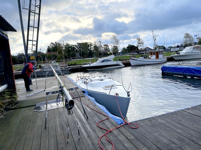 I onsdags mastade vi av våra båtar. Vi hade bokat en tidig morgontid vid klubbens mastkran, 08.00-09.30. Men vi var där lite tidigare. Nattens regn hade upphört, men det blåste friskt från sydväst. 70 meter vid Landsort, men en bra vindriktning för avmastning. Det kan ju vara lite känsligt med starka vindar när man ska masta av eller på. Nu kom vinden i stort sett framifrån, så det funkade bra. När vi lyfter masten brukar vi låta förstaget sitta kvar vilket kan ge lite extra stadga och säkerhet. Vi är ju oftast bara två när vi mastar av.